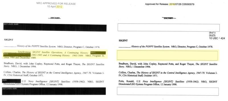 List of history papers at NRO released via FOIA in 2012 (left) List of history papers at NRO released via FOIA in 2016 (right)