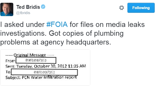 Here’s a fun one: The Associated Press’s Ted Bridis filed a FOIA for “media leaks investigation.” Got a doc about a plumbing report.