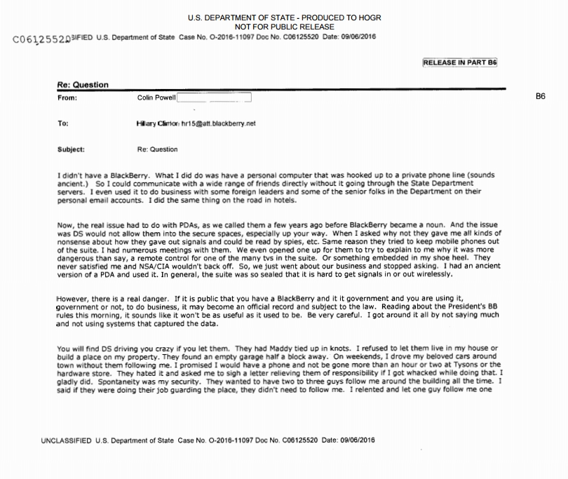 And, the Icing on top: This email from Clinton’s predecessor as SecState Colin Powell sent to the email address hr15@att.blackberry.net shows that evading public records laws at State was a bipartisan endeavor: