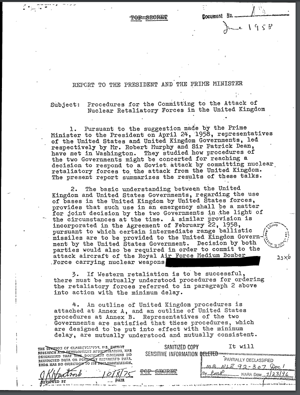 It is difficult to be sure exactly what the withheld document is because it is stored in a vault at the National Archives in College Park, MD. Nevertheless, the subject matter of the decimal file in which the withdrawn document had once resided, the fact that it was signed by Deputy Under Secretary of State Robert Murphy, and that the addressee was President Dwight D. Eisenhower strongly suggest that Tab 40B is the text of the agreement on “Procedures for the Committing to the Attack of Nuclear Retaliatory Forces in the United Kingdom,” which Murphy had negotiated with Sir Patrick Dean, a British career diplomat, who was then chairman of the UK’s Joint Intelligence Committee. The addressees on that agreement were the President and the Prime Minister and it is signed by Murphy and Dean. The agreement was declassified in full by the Dwight D. Eisenhower Library in late 1999.