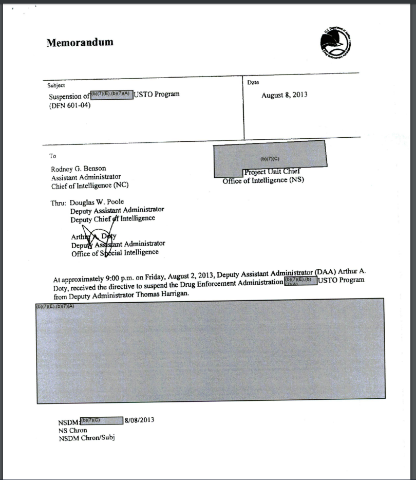 The first document is an August 8, 2013, memo on the “Suspension of [redacted] USTO Program.” The bulk of the document is redacted pursuant to FOIA’s Exemption 7; the unredacted text notes: “At approximately 9:00 p.m. on Friday, August 2, 2013, Deputy Assistant Administrator (DAA) Arthur A. Doty, received the directive to suspend the Drug Enforcement Administration [redacted] USTO Program from Deputy Administrator Thomas Harrigan.”
