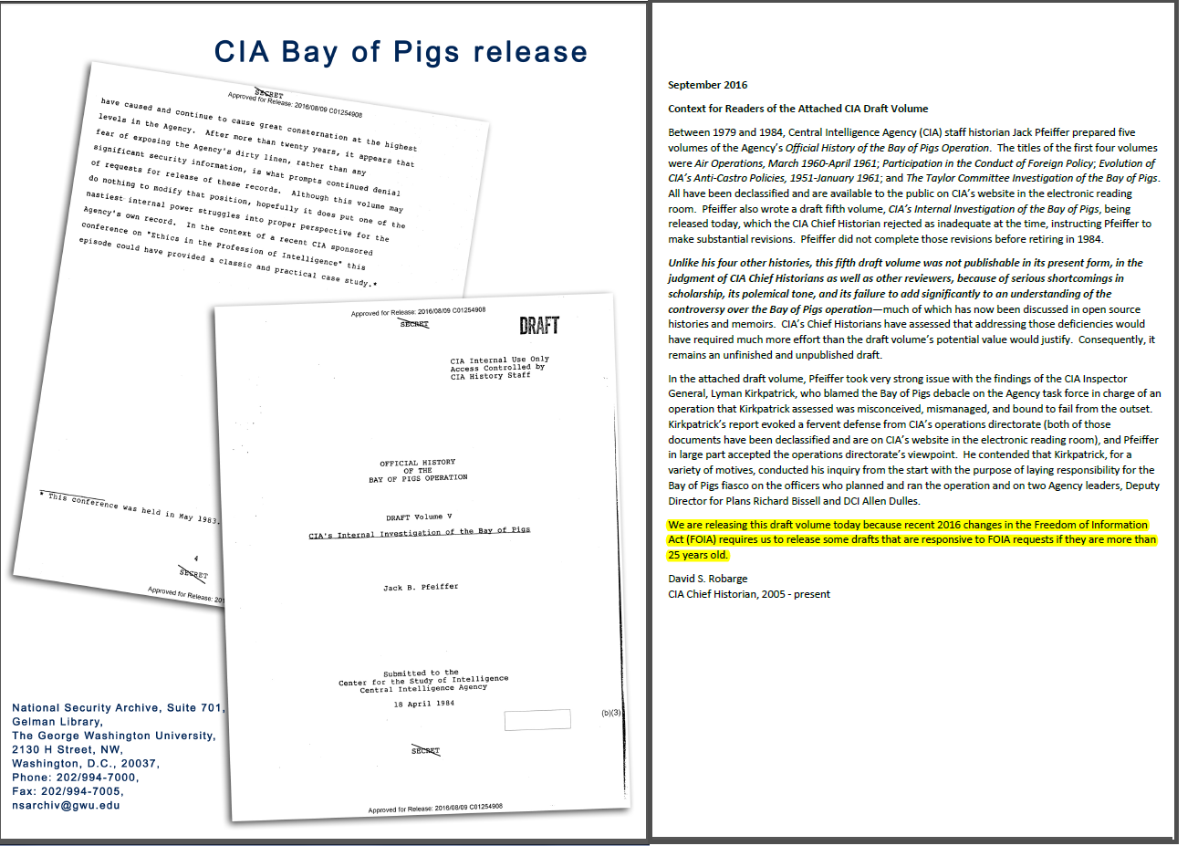 Already your far-sighted reforms have driven real change in the bureaucracy. For example, the CIA finally had to release their internal draft history of the Bay of Pigs disaster, revealing – horrors! – that the Agency suffered a nasty internal power struggle afterwards – hardly a national security secret, just bureaucratic “dirty linen,” as the suppressed history remarked. The 25-year sunset you imposed on bureaucratic drafts, on agency deliberative process, the 5th exemption to the FOIA, really works. Thank you!