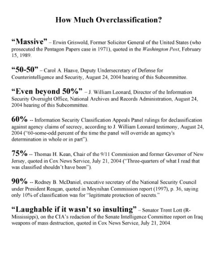 My own experience at the National Security Archive, with more than 50,000 Freedom of Information Act requests over 30 years, and millions of pages of declassified documents, tells me that McDaniel is especially on target with his 90% when it comes to historical records. For more current information, you can’t get a more informed and independent view than from the head of the 9/11 Commission, Republican Governor Tom Kean. Kean was looking at all the intelligence on the 9/11 attacks, all the signals intercepts and CIA assessments of Al Qaeda, and commented publicly that too much secrecy had been part of the problem that left our country vulnerable: “Three quarters of what I read that was classified should not have been.” (Cox News Service, July 21, 2004) So 75% over-classification on very current national security information.