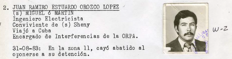 The Diario indicates that Orozco López, the second person captured by Guatemalan military intelligence in operations described in the document, was killed in Guatemala City on August 31, 1983, as he tried to flee his attackers. According to his entry, Orozco was an electrical engineer charged with radio interference for the Revolutionary Organization of People in Arms (ORPA), one of four principal insurgent groups that sought to overthrow the Guatemala government during the height of the country’s 36-year armed civil conflict.
