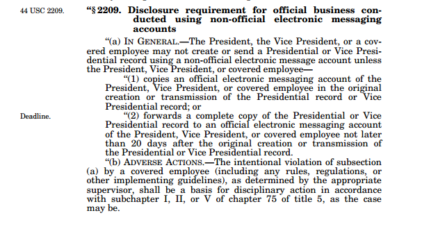 Senior Trump administration officials using Republican National Committee email accounts on Inauguration Day have two weeks to copy those emails into official White House records systems. If not, they will be in violation of the Presidential Records Act, which states “the President, Vice President, or covered employee [has] not later than 20 days after the original creation or transmission of” an official record to transfer them to official systems.