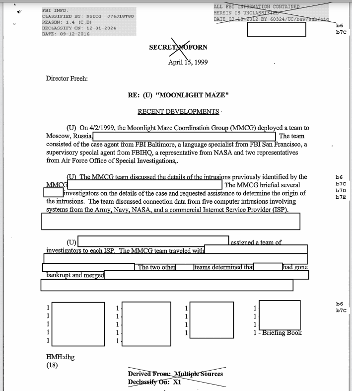 A new FOIA release from the FBI to the National Security Archive reveals more information on “Moonlight Maze,” the investigation into sophisticated cyber attacks on the Pentagon’s computer system – as well as computer systems for NASA, the Energy Department, and prestigious private institutions – in the late 1990s that were traced back to Moscow.