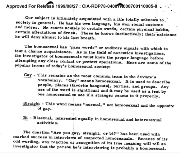 In 1980, the same year the Democratic Party endorsed a gay-rights platform, the CIA issued a three-page memo on how to “ferret out” homosexuals during investigations, possibly for blackmail. MuckRock recently published the memo as part of a post of the CIA’s cringe-worthy (and insulting) practices and assumptions about the LGBT community. The memo notes that gay men have a penchant for PO boxes and reserve their “preferably foreign” car for the weekend (the memo makes no mention of lesbians or other sexual minorities). The document also labels “gay,” “straight” and “bi” as “gay passwords.” The same document also has a section entitled, “What is a Homo?” Perhaps it goes without saying that the CIA’s official view – before being sued in 1982 – was that “the homosexual has a problem.”