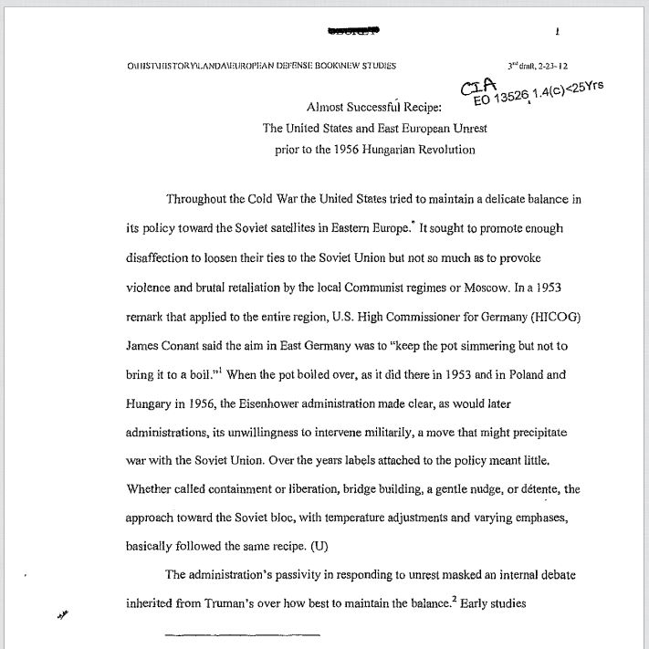 Today’s subject document is one of several studies written by Ronald Landa of the Historians’ Office of the Office of the Secretary of Defense (OSD). Landa, an experienced analyst, had previously worked in the State Department on the Foreign Relations of the United States series starting from the 1970s. He had graduated the University of Chicago and earned his PhD from Georgetown University. At OSD Landa wrote a series of historical studies profiling United States actions in a succession of situations that arose during the presidencies of Harry S. Truman and Dwight D. Eisenhower. This particular paper, “Almost Successful Recipe: The United States and Eastern European Unrest prior to the 1956 Hungarian Revolution,” serves to introduce U.S. policy for that region, which becomes problematic in Landa’s further treatise on the Hungarian Revolution. This study was declassified in January 2016.