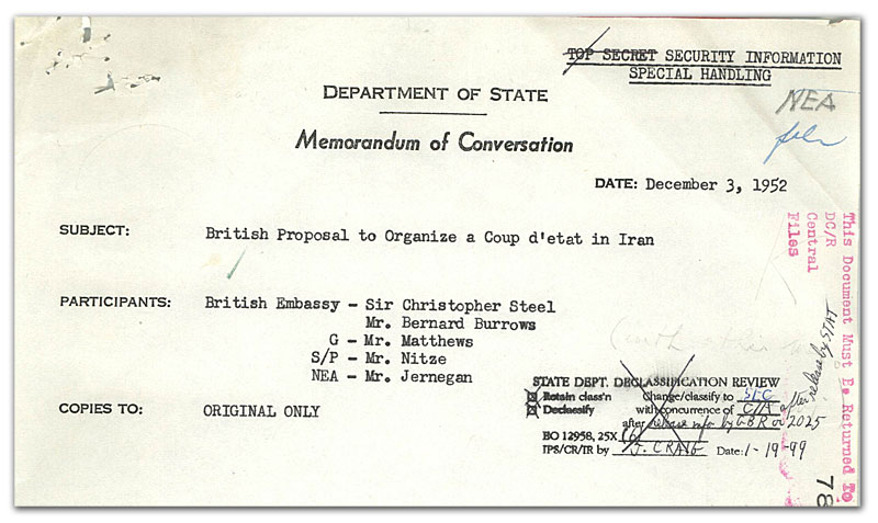 The British Foreign Office approached the Truman administration on more than one occasion in late 1952 to propose a coup to overthrow Iranian Prime Minister Mohammad Mosaddeq, according to freshly declassified State Department documents. Posted by the National Security Archive for the first time, two previously Top-Secret memoranda from senior officials at State refer to a series of communications and meetings beginning in October 1952 in which British officials tried to win US approval of Mosaddeq’s ouster.