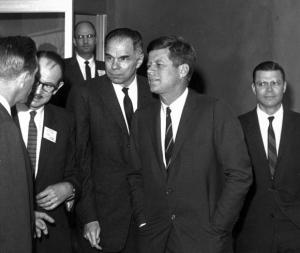 JFK and AEC Chairman Glenn Seaborg speaking with Edwin McMillan, director of Berkeley Radiation Laboratory (wearing badge), on 23 March 1962.