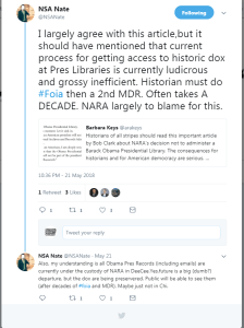The Archive’s Nate Jones notes that, while the move raises questions about access to Obama’s records and the nature of NARA’s relationship to future presidential libraries and museums, that the current process for accessing historical records at NARA-run presidential libraries is “ludicrous and grossly inefficient.” Historians typically must file a FOIA request, then an MDR or two to receive the documents, and the entire NARA-run process can take a decade or more. There is an opportunity for the Obama museum to create a more efficient model for accessing historical records.