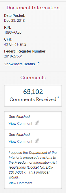 The comment period has ended for the Department of the Interior’s proposed FOIA regulations changes. The proposed rule changes – which garnered more than 65,000 comments – include allowing the DOI to preemptively reject what it defines as “unreasonably burdensome” requests, the possibility of imposing a monthly limit to the number of either pages or requests from a single requester the agency will process, and a host of other changes that may make it more difficult to obtain fee waivers and expedited processing. Time will tell whether DOI takes public concern into account when drafting the final rule, which must be sent to Congress and the Government Accountability Office before it goes into effect. As the Federal Register notes, Congress can address concern about new rules “by holding hearings and posing questions to agency heads, by enacting new legislation, or by imposing funding restrictions.” The National Security Archive signed onto Citizens for Responsibility and Ethics in Washington’s (CREW) comments opposing the rule change.