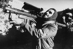 An Afghan guerrilla handles a U.S.-made Stinger anti-aircraft missile. The shoulder-fired, heat-seeking missile supplied to the Afghan resistance by the CIA during the Soviet invasion of Afghanistan, is capable of bringing down low-flying planes and helicopters.
