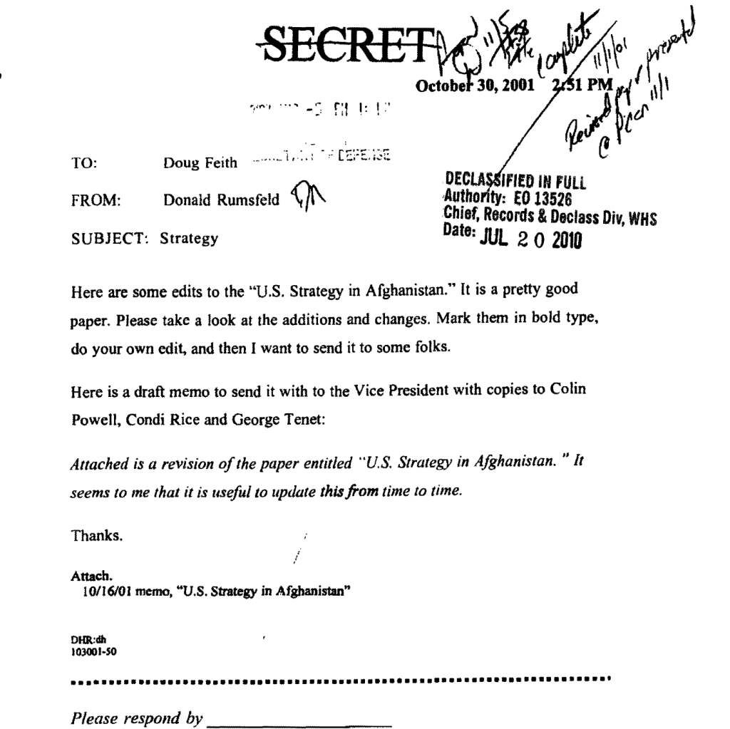 The National Security Archive is celebrating the end of 2021 by looking back to our most impactful postings of the year and highlighting the documents behind them. This week, we’re revisiting former Secretary of Defense Donald Rumsfeld’s declassified October 30, 2001, memo to Under Secretary of Defense for Policy, Doug Feith. Entitled “Strategy”, the memo, which concerned the U.S. Strategy in Afghanistan, was featured in the Archive’s August 19, 2021, posting, Afghanistan 20/20: The 20-Year War in 20 Documents.